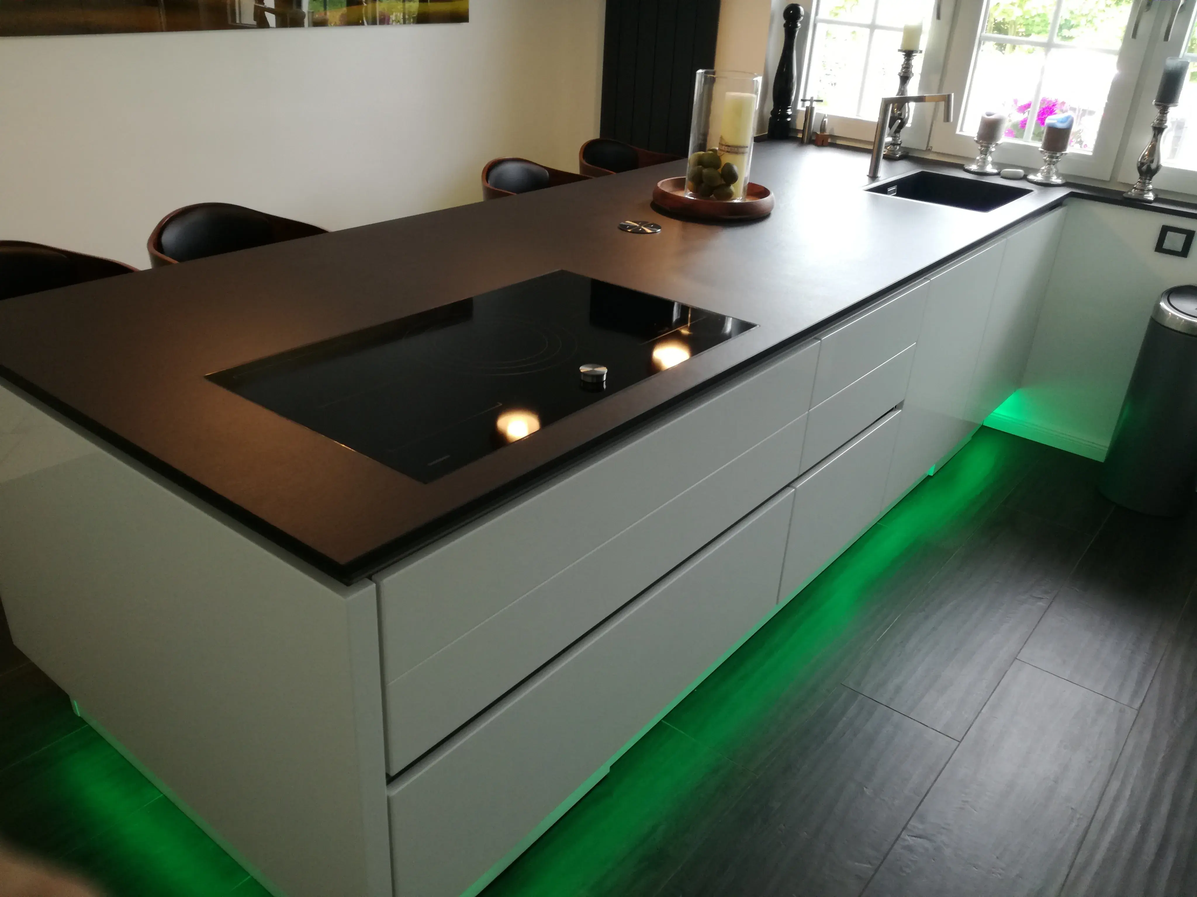Kundenküche in L Form mit Sitzgelegenheit der Marke Nobilia und Keramikarbeitsplatte